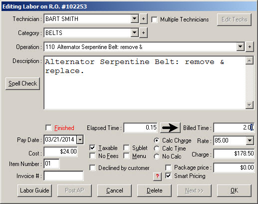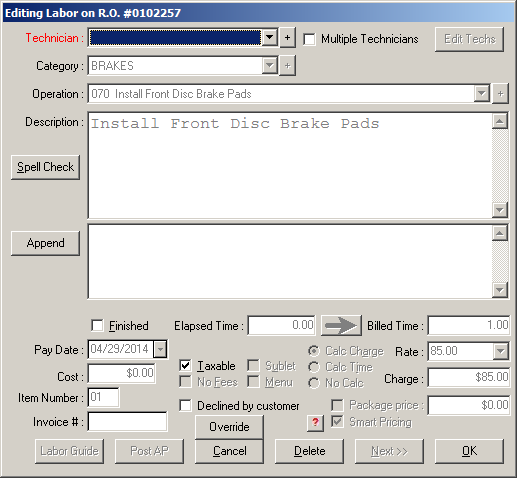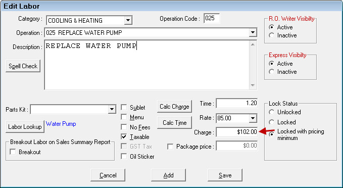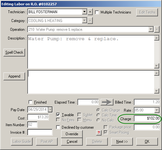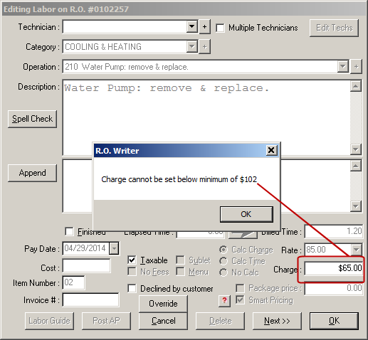 The Charge field can be edited but cannot be set lower than the minimum price set for the labor operation. In the graphic below, the minimum Charge for the labor operation is set at 102.00.