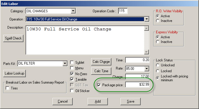 - Has a package price, the Package Price and the Charge fields can be changed but not to less than the minimum price set for each.