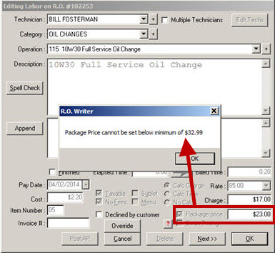 If you attempt to set the package price lower than the $32.99 on an estimate or repair order, a warning appears notifying you that the package price cannot be set below the minimum.