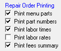 This selection determines if part numbers are printed on the repair order. Some shops do not select this feature so that customers cannot go to the parts store and compare prices.