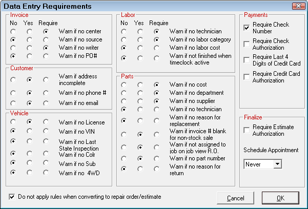 If information is required and not readily available, users often enter something in order to fulfill the requirement and get to the next step even if the information incorrect. If you're not careful here, you can wind up with a great deal of repair order data that is inaccurate making many of your reports unusable.