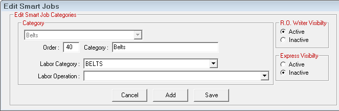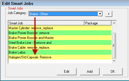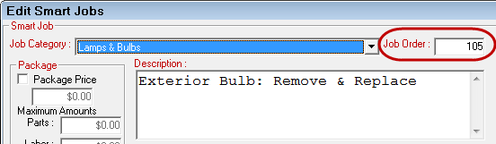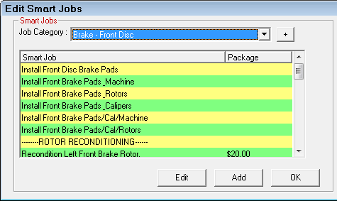 Smart Jobs allow you to configure parts and labor in one job. When selected for a repair order, the labor and parts information from the catalog are automatically transferred to the repair order. The Edit Smart Jobs screen opens.