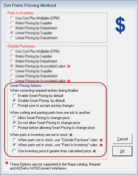 Smart pricing gives you the ability to set pricing for parts using cost ranges by supplier, parts department or type of work. You can price inventory using these smart pricing matrices.