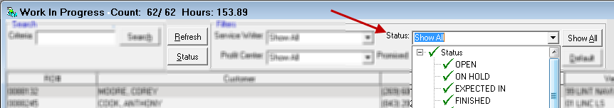 This is the default status when a repair order is "Open" does not appear in the Status/Comments column. If that column is blank, it means the Status is Open and there are no repair order notes. |