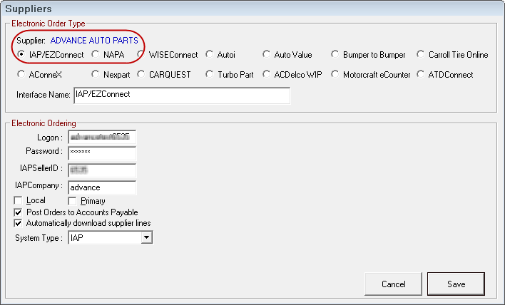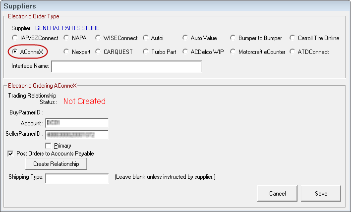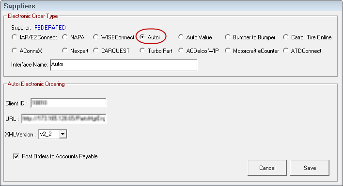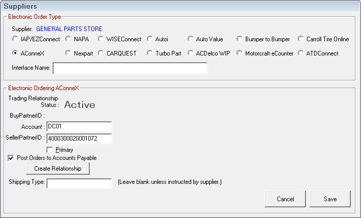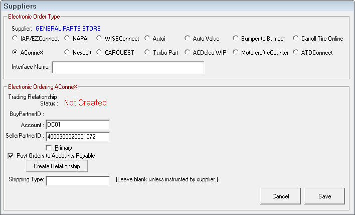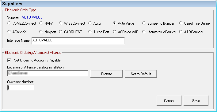 After you receive the interface information from your Bumper to Bumper or Auto Value supplier, enter them on this window.