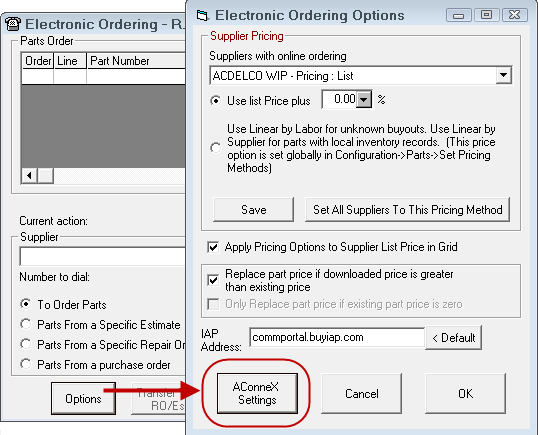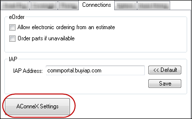 Select your AConneX supplier in the dropdown list and click the Options button., then click the AConneX Settings button. The AConneX Settings window opens. |