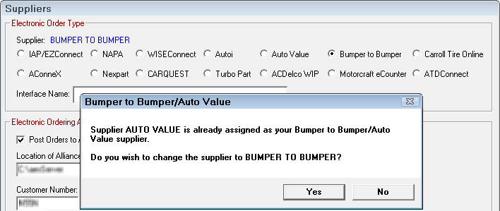 If you attempt to assign Bumper to Bumper or Auto Value to another supplier, you are prompted to change the supplier: