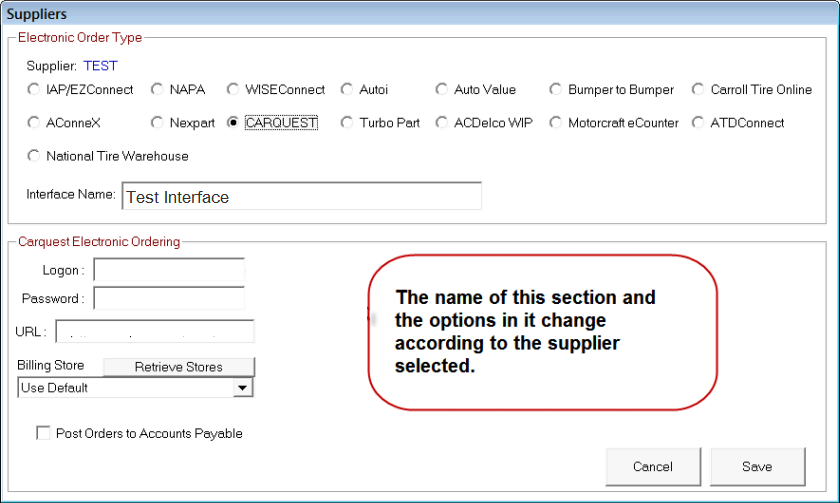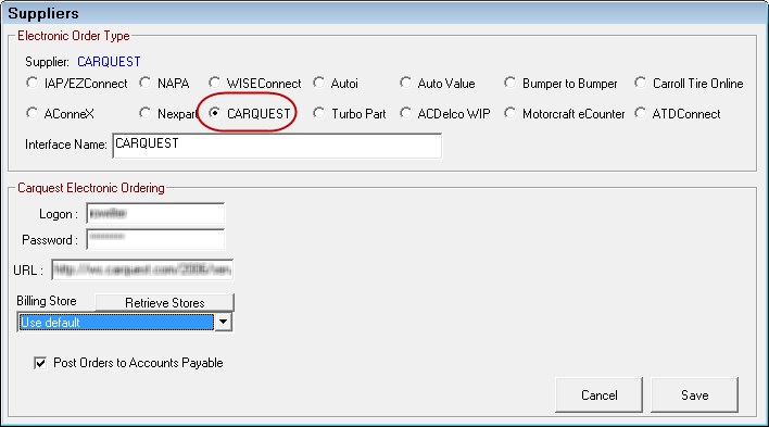 After you receive the interface information from your CARQUEST supplier, enter it on this window.