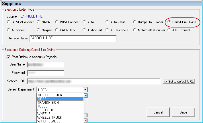 After you receive the interface information from your Carroll Tire supplier, enter it on this window.