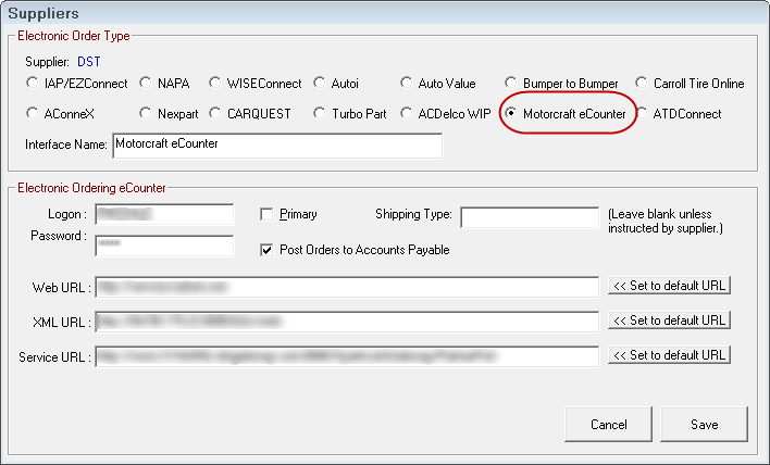 There are three DST interfaces: Motorcraft eCounter, ACDelco WIP from DST, and TurboParts. You can set up an interface for each per supplier or one supplier with an interface for each depending on your business agreements.