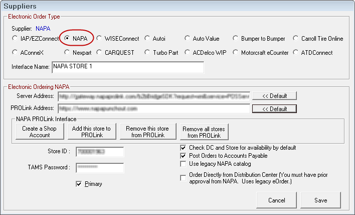 After you receive the interface information from your NAPA partner, enter it on this window. When this interface is configured, you can order directly from NAPA PROLink.