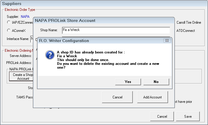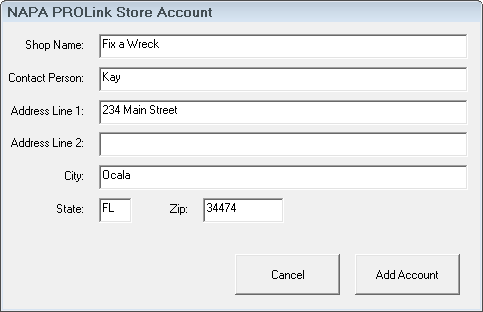 - Create a Shop Account button - Click to create a shop for the NAPA PROLink Interface in Smart eCat. Enter your shop information and click the Add Account button.
