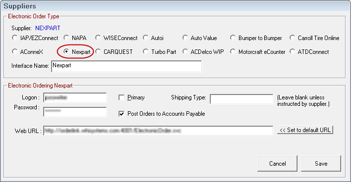 After you receive the interface information from your Nexpart supplier, enter it on this window. When this interface is configured, you can order parts through the Nexpart interface.