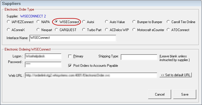 After you receive the interface information from your WISEConnect supplier, enter them on this window. When this interface is configured, you can order directly from the WISEConnect interface.
