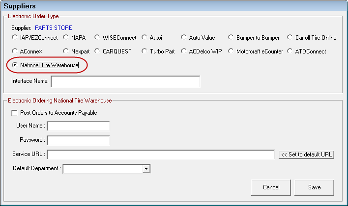 Setting up National Tire Warehouse as an electronic ordering interface also allows you search for and order tires in Tire Quote.
