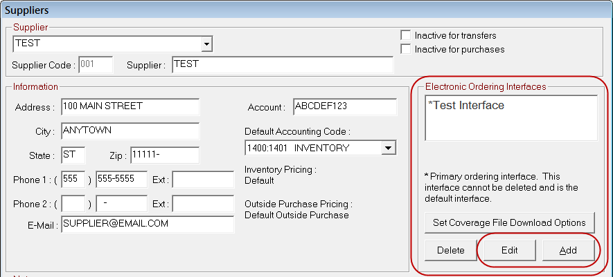NOTE: You save the details of the electronic interface when you click Save on the Suppliers window.