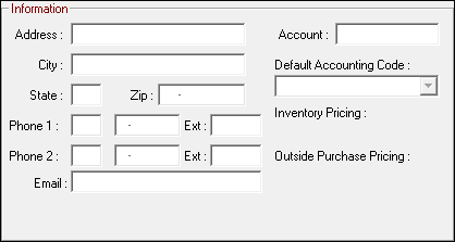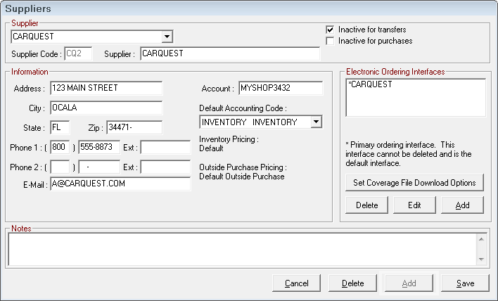 You enter suppliers on this window. After you save a supplier, it is available to select throughout R.O. Writer.