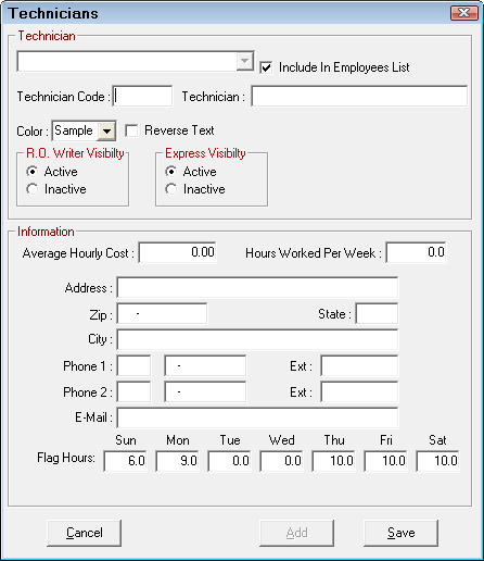 - Enter the technician’s code and name, average hourly cost, and the hours worked per week.
