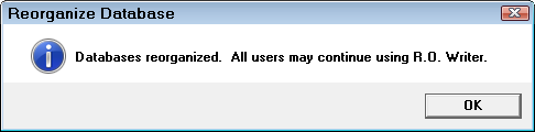 While the database is being reorganized, do NOT close R.O. Writer or cancel the reorganization process in any way! Doing so puts the database at risk of being compromised, which WILL result in having to call R.O. Writer Technical Support for assistance.