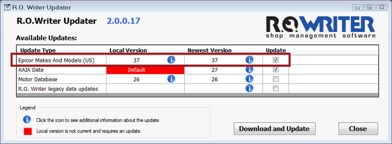You update the R.O. Writer database with the newest Epicor makes and models when you run R.O. Writer Updater.