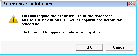 The database reorganization process requires exclusive use of the database. All other users must exit any and all R.O. Writer modules prior to running a database reorganization. The following prompt appears: