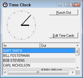 Click the Quick Functions menu > Time Clock (CTRL + J). The Time Clock window displays a list of all employees (including technicians) and their current status: In or Out.