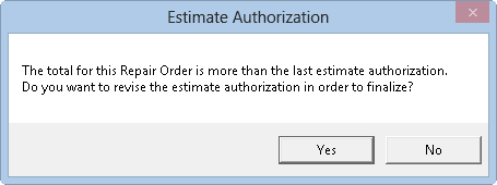 Depending on the R.O. Writer Configuration settings, you may be prompted to enter, verify, or validate information about the repair when the Finalize button is clicked.