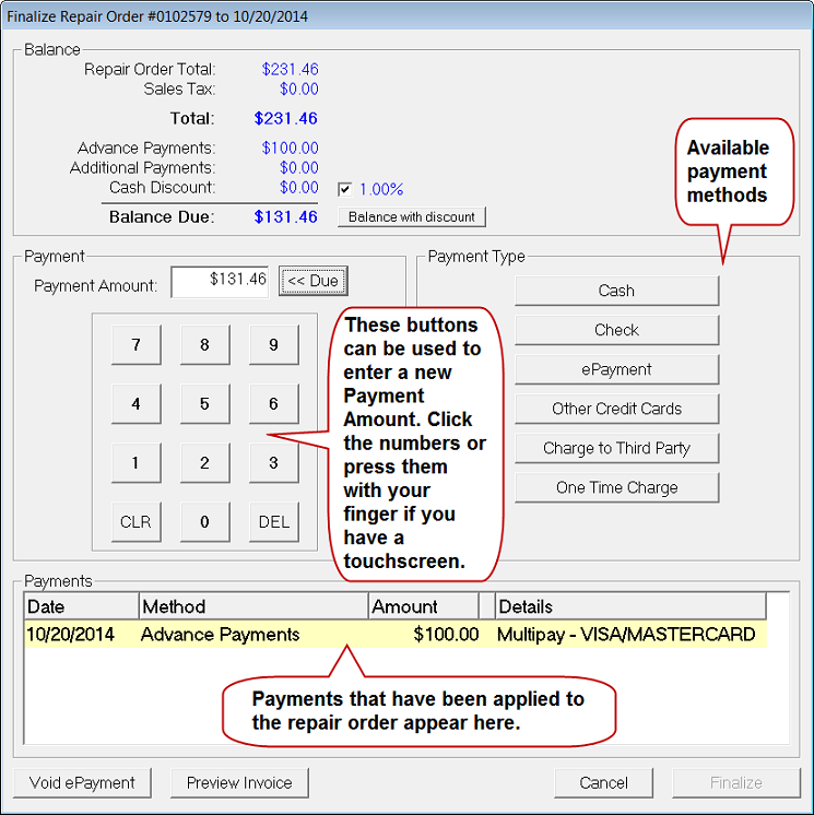 The Finalize button is inactive until the Balance Due is zero. When it is active, click this button to finalize the repair order.