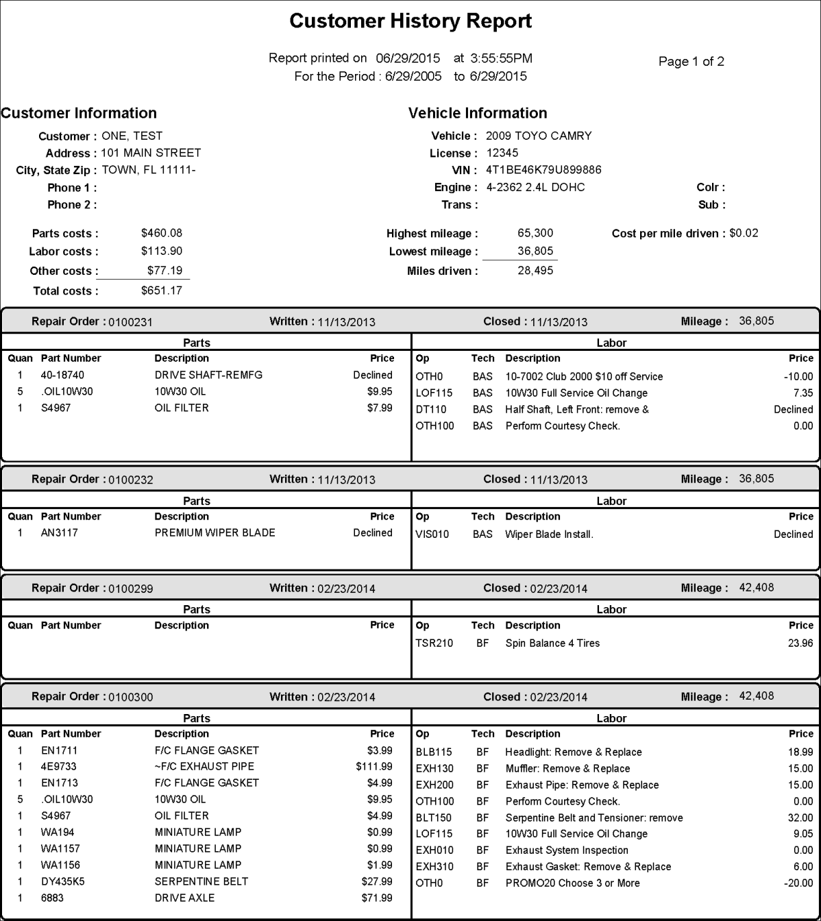 The Customer History Report compiles all the closed repair orders (called "invoices") or estimates into one report. Each Customer History Report is all the invoices or estimates for one vehicle.