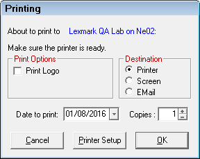 - When you click the Print button, you can choose to print to the screen or the printer on the Printing window.