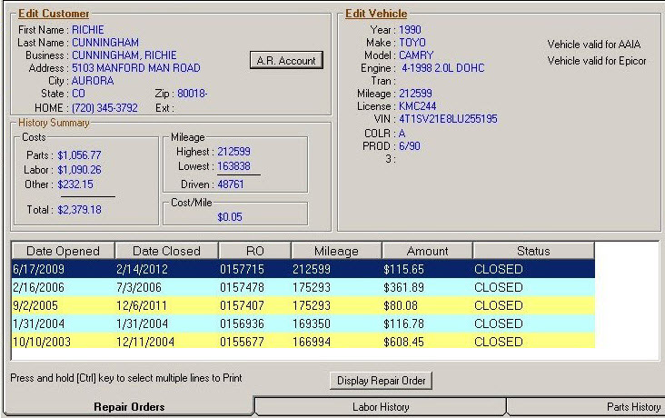 Search for and select the customer and the vehicle and the customer's history for that vehicle opens.