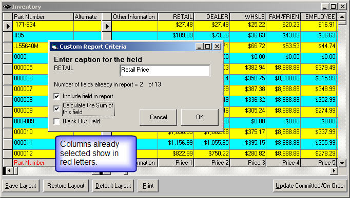 Enter the Caption for that column which you want printed on the report or accept the default and select the box include this field in the report. A helpful tip is columns that are selected to print on the report will show the field names at the bottom of the columns in red letters.