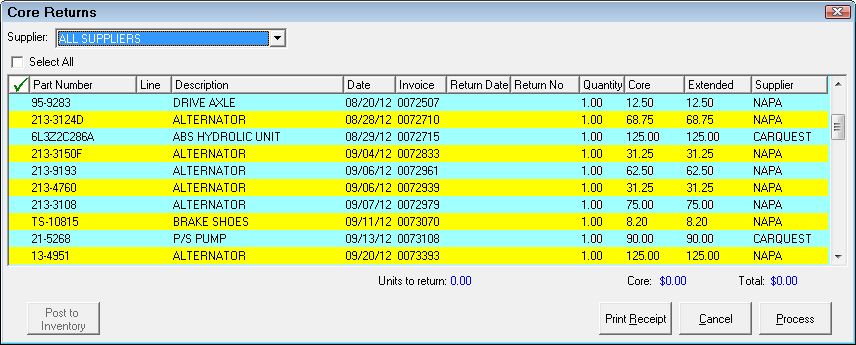 To view cores marked as received and mark them as sent and process credits, click the Core Return button . Determine the supplier that cores are to be returned to.