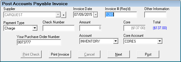 This feature supports posting parts with cores through Accounts Payable, P.O. Management, or Post Receipts (See Posting Parts With Cores), tracking returned cores, and posting credits from the supplier when the cores are returned or when you receive the credit.