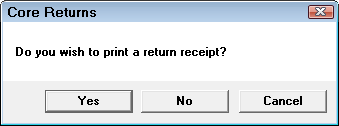 You can mark selected cores as returned when they are shipped back to the supplier by clicking the Process button. When this button is selected, you are prompted to print a return receipt. Select Yes to print a return receipt; select No to continue marking cores as returned but skip printing a return receipt or select Cancel to exit without marking cores returned.