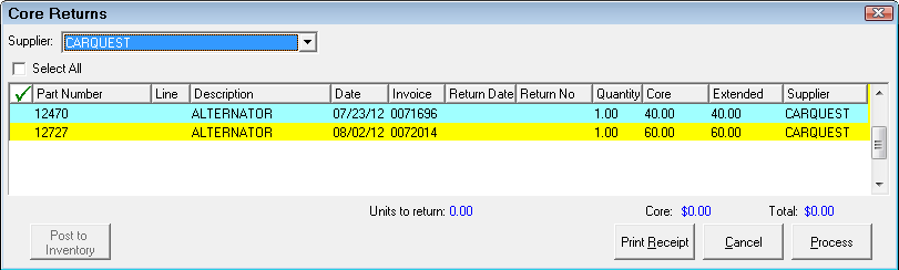 If you do not want to post a credit invoice until the credit is received at a later date, select No and the core is marked as returned but will remain in the part returns. To process the credit at a later date, select the supplier and the core(s) and click the Process button again and an AP credit is posted and you are prompted to print an invoice. When the credit is posted, the core is removed from the Core Returns.