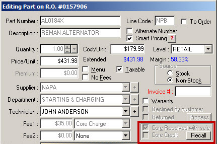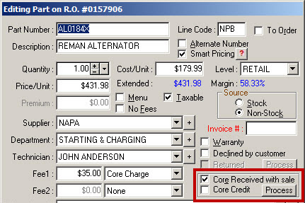When a part that includes a core is added to the repair order and the Core Received with sale is checked, the customer is not charged for the core and the core is placed into the Core Returns feature in inventory when the repair order is finalized or when the Process button is selected.