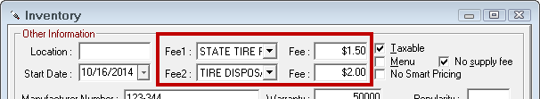 Two optional fees, such as a disposal fee, environmental fee or a core charge. Select the type of fee from the dropdown list and enter the appropriate amount in the Fee field.