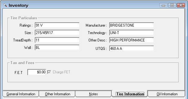 This tab is blank unless the part is included in the tire group. If the part is in a tire group, this tab includes active fields where you can enter tire information.