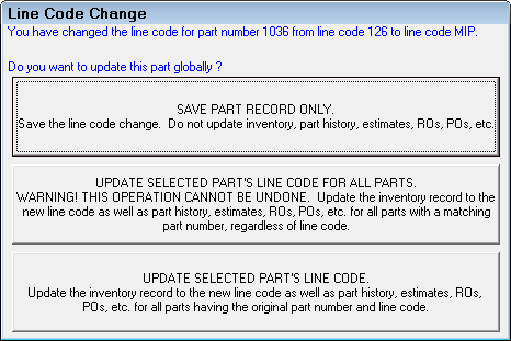 This is the part manufacturer’s line code. You can use it to group parts on Inventory Reports. A line code is automatically added when posting parts from some of the online catalogs such as Epicor. You need to update these parts in History and Inventory when different line codes are added from parts catalogs. The When Changing Existing Part's Line Codes setting in PO Transfer Configuration determines how existing line codes are updated. Prompt For Action is the default, which means that when the new line codes come in, you are prompted as to what you want to do with the new line codes.