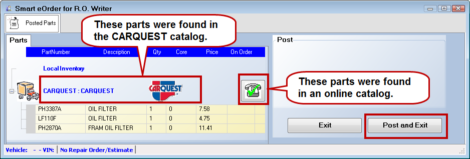 You can click the button in the toolbar to order parts. However, if you are not posting to inventory, it is easier to use Smart eOrder in the R. O. Writer main module to order parts on open tickets rather than using PO Management.