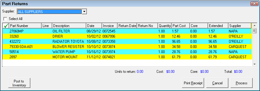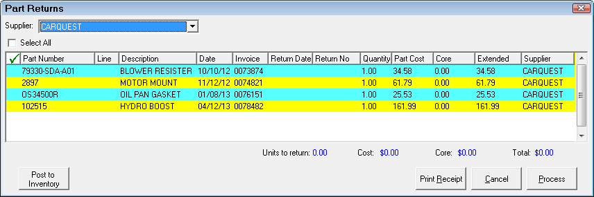 When you select a specific supplier, only parts marked returned for that supplier will display. You can check the Select All box to select all parts or double-click on a part to select it. Parts selected are indicated with a Green check mark in the first column.