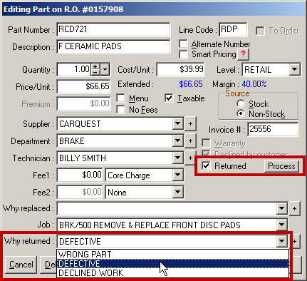 For a video overview of returning parts, watch the video below. (This video was recorded using R.O. Writer 1.31.)