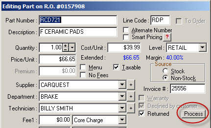 When the Process button is selected, the part is placed into the Part Returns feature in inventory before the repair order is finalized.