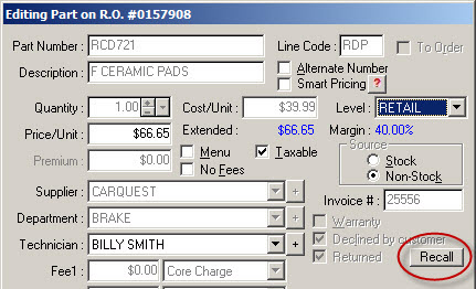 If the part was processed in error and the repair order is still open, the part can be recalled by clicking the Recall button. This will remove the part from the Part Returns feature.