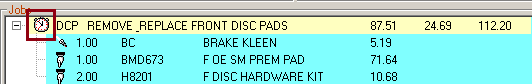 To start the time clock, select the appropriate labor operation on the Parts/Labor Tab and press the letter "t" on the keyboard. A small clock appears to the left of the technician’s code to indicate that the clock is running.