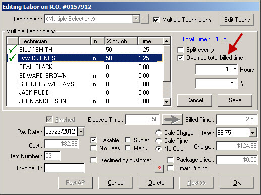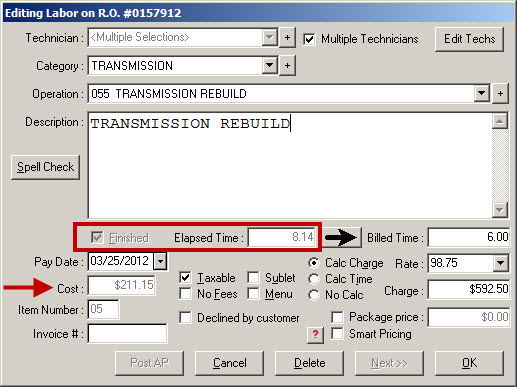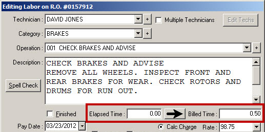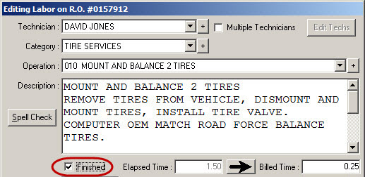 Labor cost can be configured to be calculated on the Elapsed Time instead of the Billed Time after the Finished option is selected. The cost is then calculated based on the Billed Time multiplied by the technician's rate.
