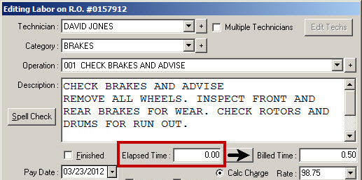 Select the appropriate labor operation on the Parts/Labor Tab, and press the letter "t" on the keyboard. The small clock to the left of the technician’s code no longer appears and the time is recorded in the Elapsed Time field.