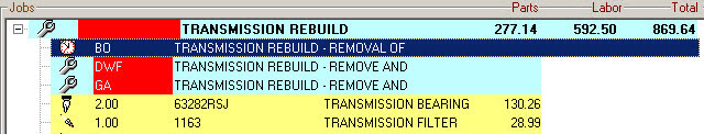 When multiple technicians are assigned to one job, the labor is split into the main row for the labor operation and a sub-row for each technician; the "sub labor" rows.