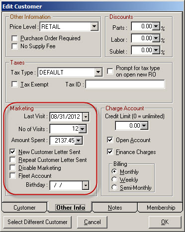 The Other Info tab contains a Marketing section where you enter the marketing information for the customer.